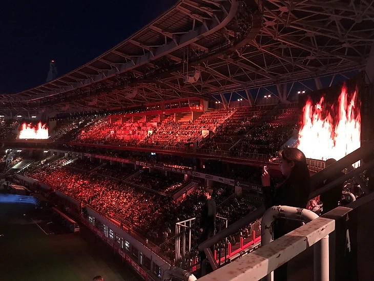 Приятно вечереет, включаются прожектора: в отличие от «Локомотива», нам тут в конце сезона хорошо. 20:55, трибуны все еще с нехилыми проплешинами, зажигаются небольшие экраны по углам — Мэйси Уильямс, Эмилия Кларк и другие актеры саги вспоминают первый кастинг, лучших друзей на площадке и самые запомнившиеся сцены. Вышел почти рекап восьми сезонов: мило, трогательно, но очень длинно. На часах уже 22:00 (показ серии, напомню, был заявлен на 21:30).