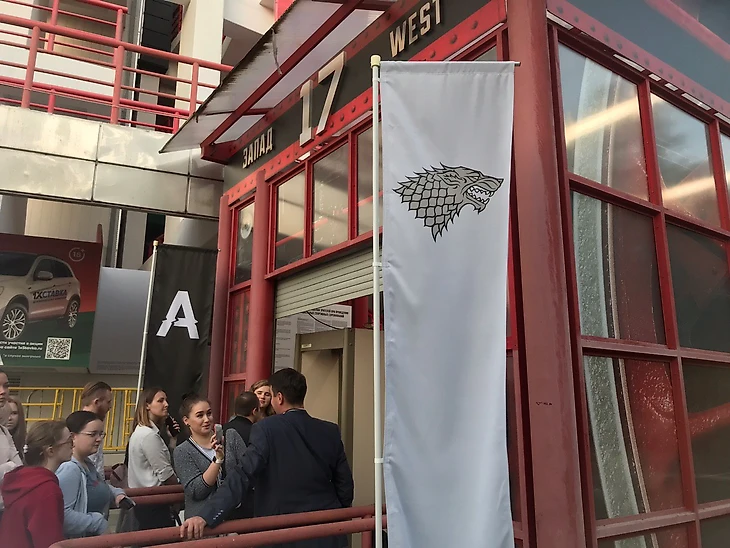 Ближе к восьми народ организует новые очереди, у входов на стадио. Гейты красиво оформили по тематике ИП: возле северных, например, висели флаги с лого кланов с Севера — Старков и Грейджоев. К своему неудовольствию, обнаружила себя причисленной к последним.