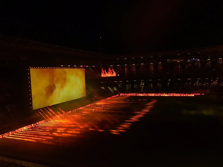 Стартовые титры мелькнули на экране только в 22:20. Все грандиозно и красиво, только звук не доходит до самого верхнего яруса сбоку — слышу оттуда недовольное «а можно погромче?»