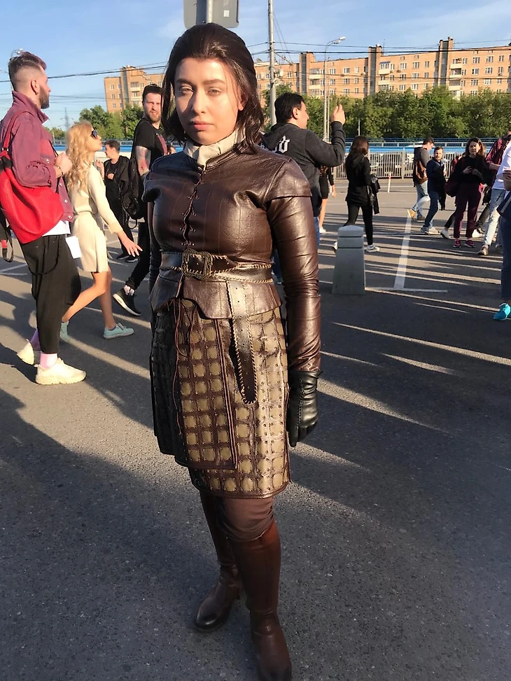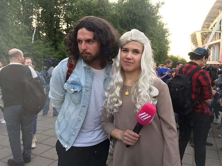 Но брат совершенно случайно выиграл два билета в рандом-розыгрыше от «Ситимобил» и вот, к 18:30 я притрюхала к Черкизовской на автобусе. Тут жарит почти заходящее солнце, народ толпится у входов на территорию, пятясь к тени. Здесь больше молодежи, по прикидкам — от 16 до 25. Никакого ажиотажа, никакой толкучки, никаких разговоров об «Игре престолов». Если бы рядом скромно не скользнула в толпу дама в свитшоте Mother of Dragons, а на камеру не попозировала первая (и почти единственная) найденная косплеерша, то можно было спокойно принять эту толпу за публику очередного матча «Локо» с семейного сектора.