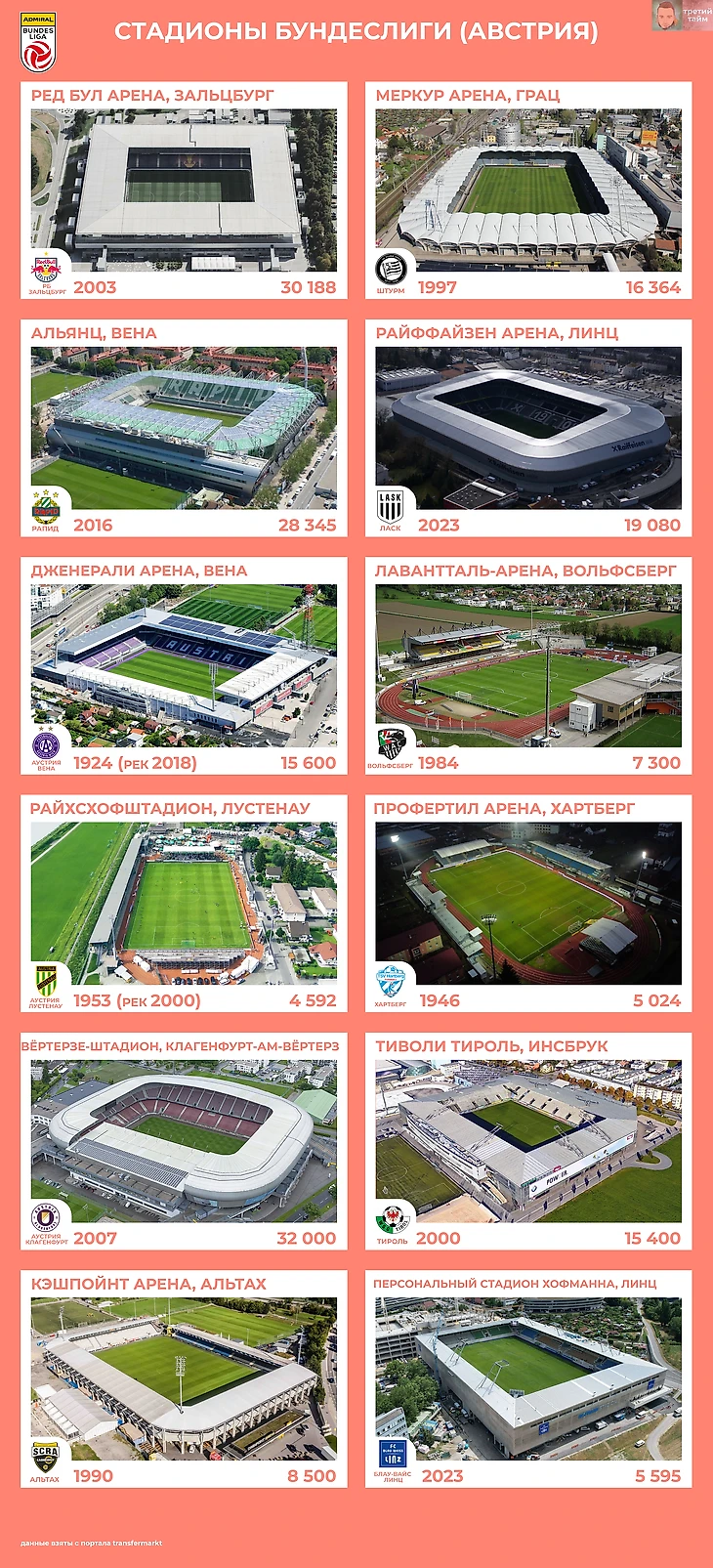 Все очень прагматично. Кому-то такой стиль может не понравится, а кто-то увидит в этом эталон минимализма. Да, стадионы клубов в Австрии очень похожи, они простые в оформлении, но при этом очень уютные. Самый большой стадион, к удивлению, не у «РБ Зальцбурга», а у «Аустрии» из Клагенфурта, вмещающий 32 тыс. человек. У «РБ Зальцбург» стадион вмещает чуть более 30 тыс. Ну а на третьем месте стадион «Рапида», вместительность которого чуть более 28 тыс.