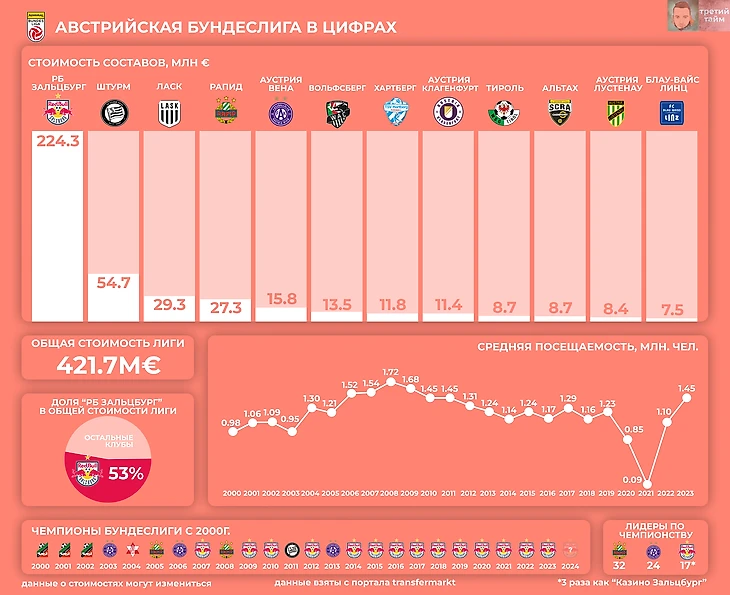 Стоит отметить, что лига расширилась с 10 до 12 клубов только в сезоне 18/19. А уже через год пришел ковид и показатели рухнули до минимальных отметок. Но уже в сезоне 22/23 показатели обогнали докороновирусные времена, хотя до пика популярности лиги еще далеко. Сам же пик посещаемости в 21 веке пришелся на времена вливания денег в «РБ Зальцбург» и борьбу «Рапида» за чемпионство в 2008 году. В это же время зальцбургский клуб тренировал Трапаттони.