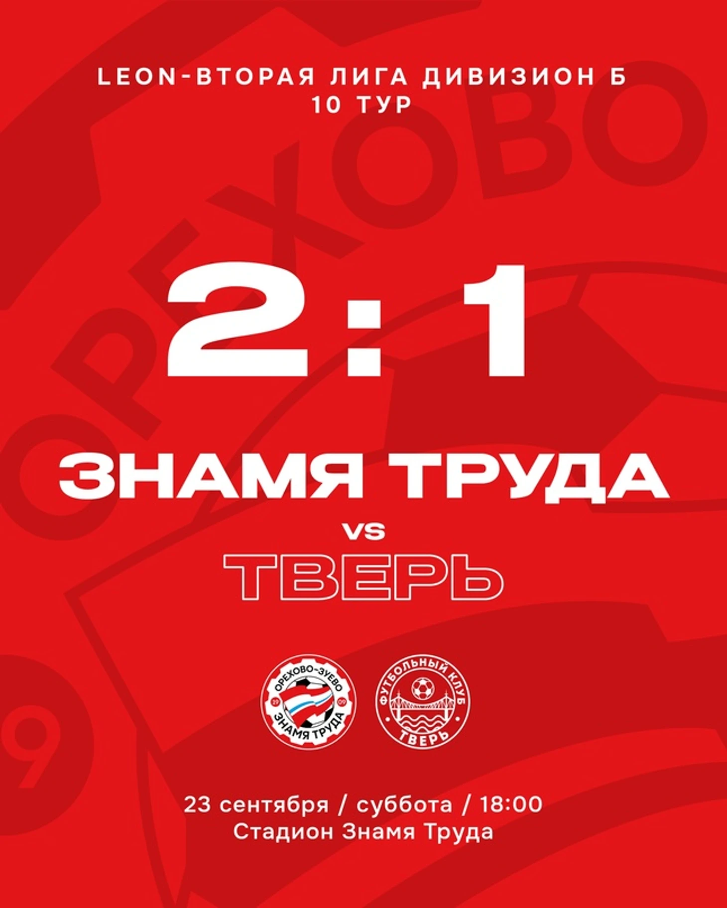 Вчера прошел матч 10 тура Второй лиги Б между «Знамя Труда» и «Тверью». На 48 минуте счет открыла «Тверь» голом Ильи Вострикова. Затем на 69 минуте Глеб Бурков получил красную карточку за лишение явной возможности забить гол.