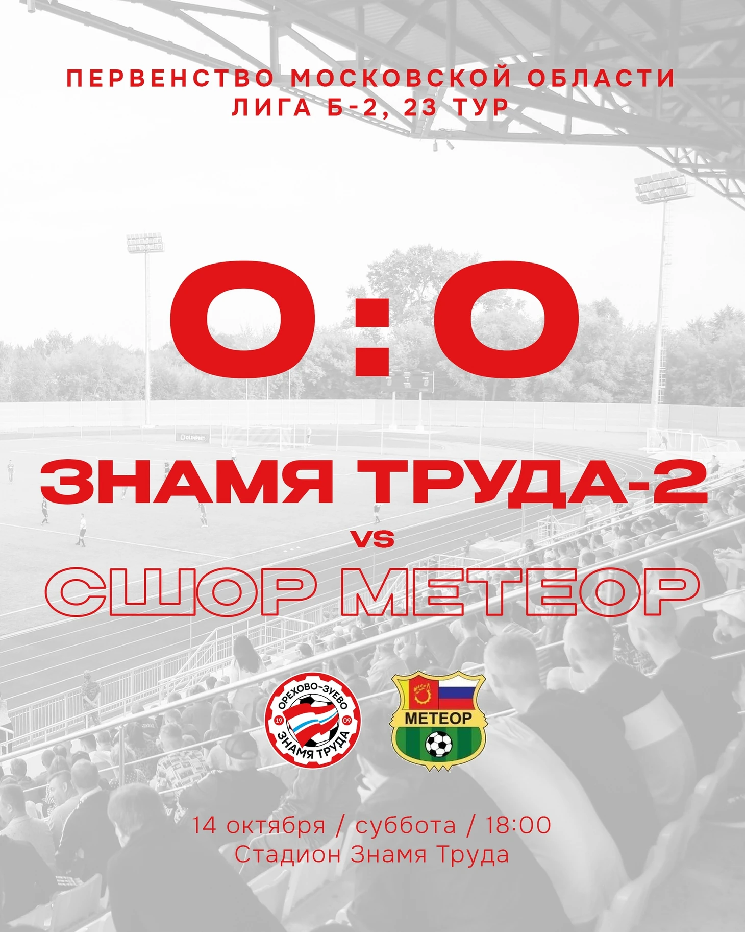 Вчера прошёл матч 23 тура первенства московской области лиги Б-2 между «Знамя Труда-2» и СШОР «Метеор». Матч кончился нулевой ничьей.
