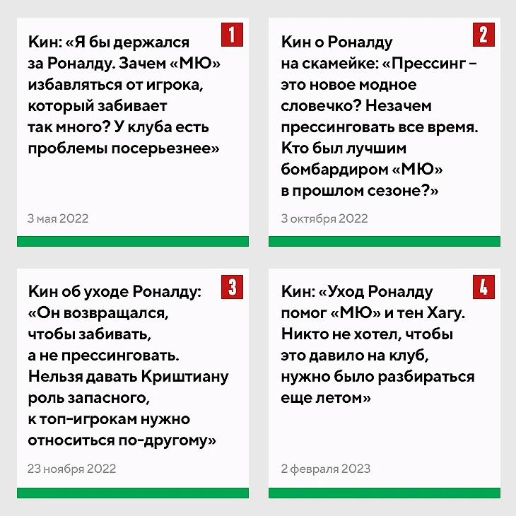 Внимательно смотрим на первый и последний тезисы. В феврале, когда ситуация в клубе улучшилась и «Юнайтед» стабильно побеждает, Кин сотрясает воздух заявлениями в духе «А ведь я говорил, я всегда так думал!». При этом и до лета (в мае), и после (в октябре и ноябре) Рой возглавлял отряд свидетелей Криштиану и постоянно атаковал «МЮ» и Тен Хага (при этом не обращаясь к Эрику напрямую), говоря о неуважении и неправильной работе с Роналду. Даже когда контракт с Кришем расторгли, Кин все равно рассуждал о целях, роли запасного и работе с топ-игроками, метая популистские тезисы. А после второго полуфинала Кубка лиги вот так смотрел на Тен Хага во время интервью. На Тен Хага, чью работу с Криштиану он так жестко критиковал в предыдущие месяцы. Чего не сделаешь ради билетов на финал.