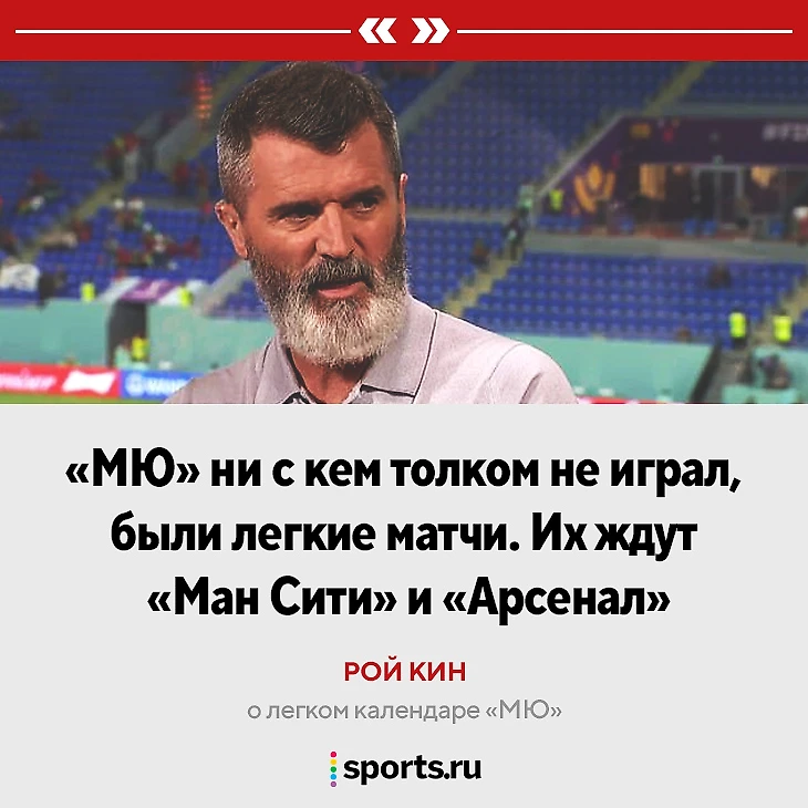 Перед январским эфиром, в котором Рой сказал, что «МЮ» «толком ни с кем не играл», у Тен Хага уже были победы над «Ливерпулем», «Тоттенхэмом», «Арсеналом», ничьи с «Челси» и «Ньюкаслом». Может, стоило хотя бы открыть календарь под съемкой? Да не, бред какой-то. Причем сам Кин после сентябрьского матча говорил: «Победа над «Арсеналом» – еще одно серьезное заявление. Именно такого ты и ждешь от «Манчестер Юнайтед».