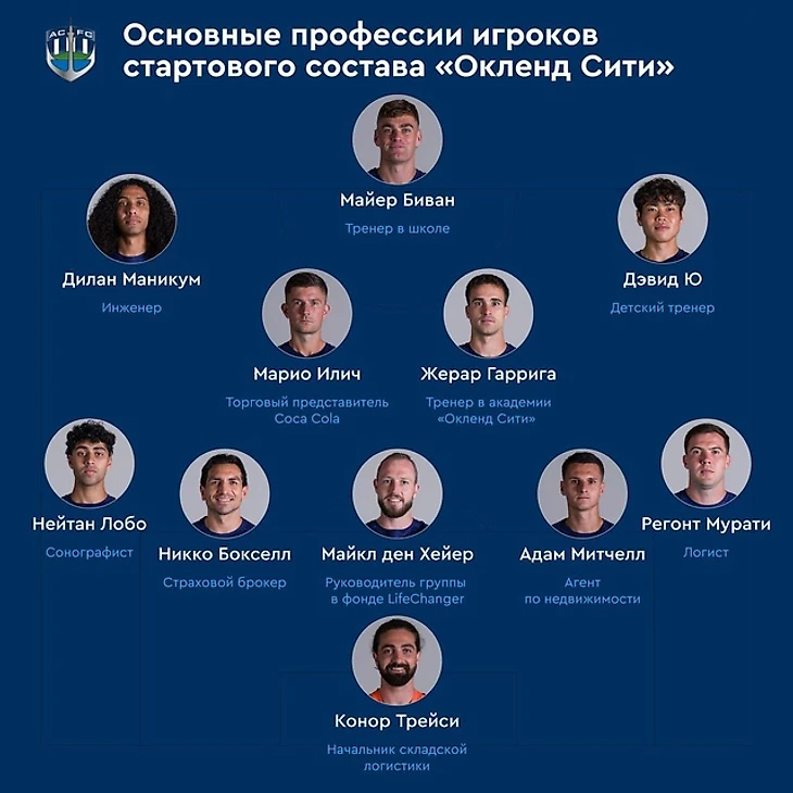 Солидный список, не так ли? Всего 38 трофеев за 20 лет существования клуба. Но теперь стоит посмотреть на уровень самой команды. Transfermarket оценивает стоимость команды в 4.58 млн Евро, а самые дорогие игроки - Марио Илич и Натан Лобо - стоят по 275 тыс. Евро. Уровень ФНЛ-2 какой-то. Но самое интересное в том, что клуб любительский, и для большинства игроков оттуда игра за клуб - не основное занятие, они работают на работе. Например, основной вратарь Конор Трейси работает на складе ветеринарных товаров, а вингер Дилан Маникум - инженер. Основные профессии игроков стартового состава можете посмотреть на фотографии ниже. Спасибо паблику Fuel Your Growth в ВК.