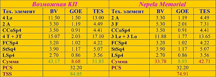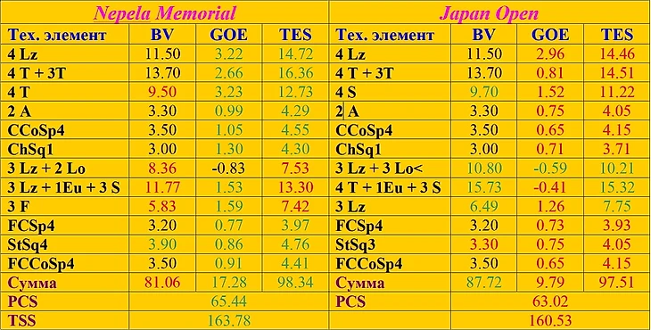 Тем не менее, рекорд, установленный на Мемориале Непелы, как по TES, так и по TSS не был побит. Ниже немного сравним обе произвольные программы. (В ПП на Japan Open тех. элементы идут не по порядку для лучшего сравнения).