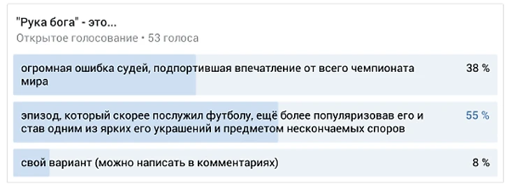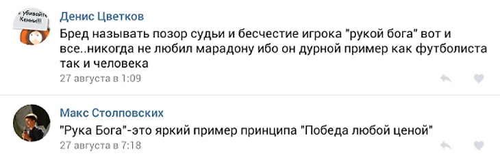 В своём контактовском сообществе «Золотые футбольные матчи» я тоже задал подписчикам один из обозначенных выше вопросов в виде голосования и кроме ответов получил несколько любопытных комментариев. Привожу два из них . А что думаете про «руку Бога» вы?