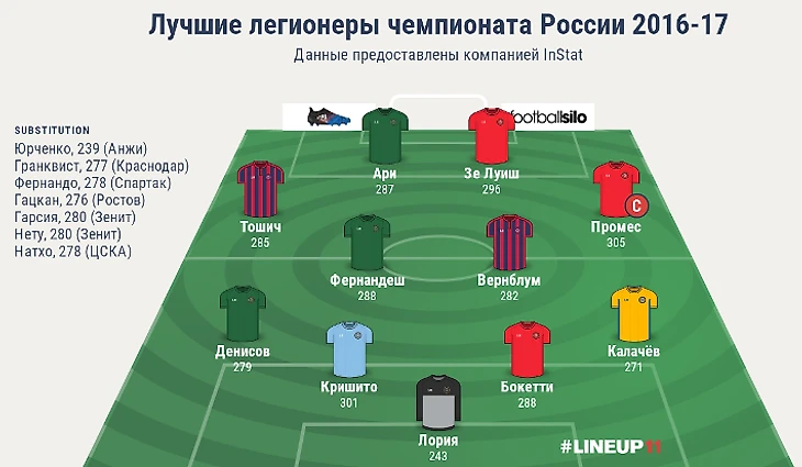 Символическая сборная собрана из футболистов-легионеров с лучшими показателями InStat Index за сезон. Ещё одно условие: каждый игрок должен был сыграть не менее 15 полных матчей (1350 минут) в сезоне.