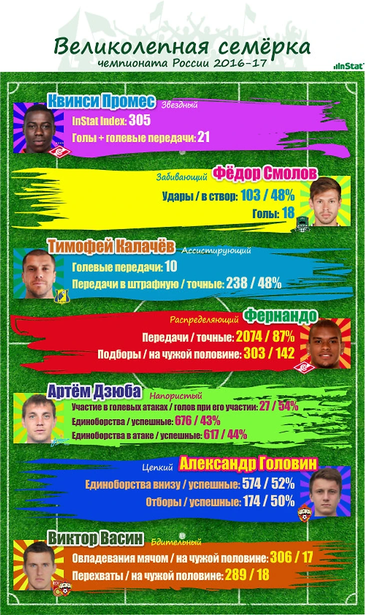 А давайте посмотрим на количественную статистику игроков несколько с иной стороны и выделим футболистов, которые стали лидерами в тех или иных компонентах игры в минувшем сезоне. Начнём мы с самых крутых парней чемпионата России 2016-17. Итак, вашему вниманию рубрика «Великолепная семёрка».