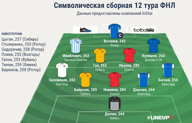 Лучшим клубом 12 тура ФНЛ стала краснодарская "Кубань" со средним общекомандным рейтингом InStat Index, равным 232 баллам. Худших же сразу двое: "Шинник" и "Олимпиец", набравшие лишь по 193 балла.