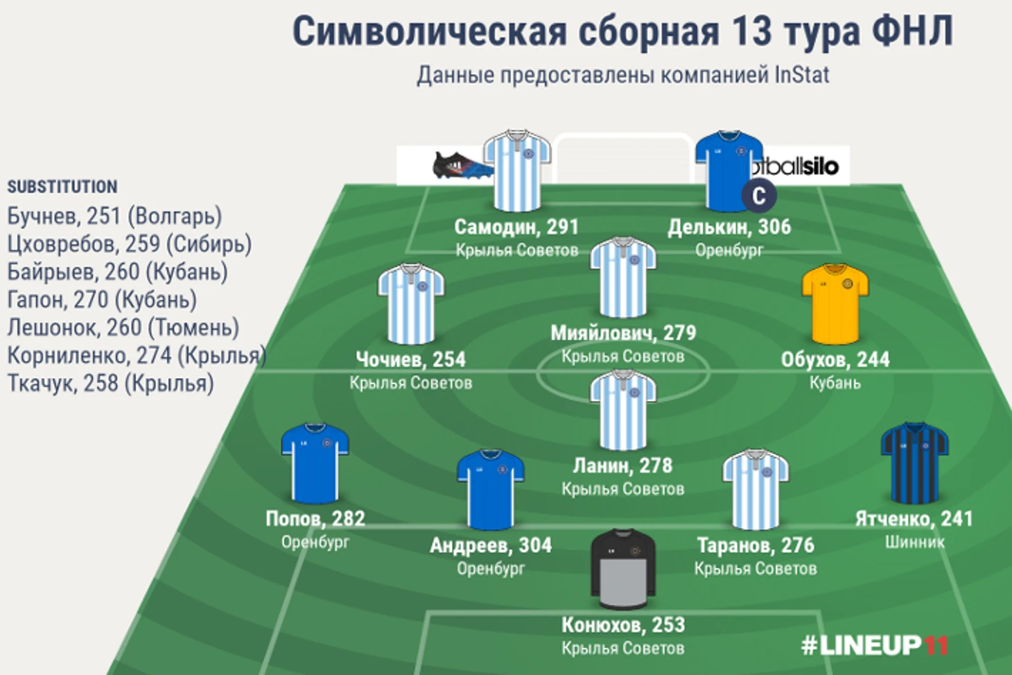 Лучшим клубом 13 тура ФНЛ стали "Крылья Советов" со средним общекомандным рейтингом InStat Index, равным 250 баллам. Худшей же командой оказалась "Луч-Энергия", набравшая лишь жалкие 154 балла.