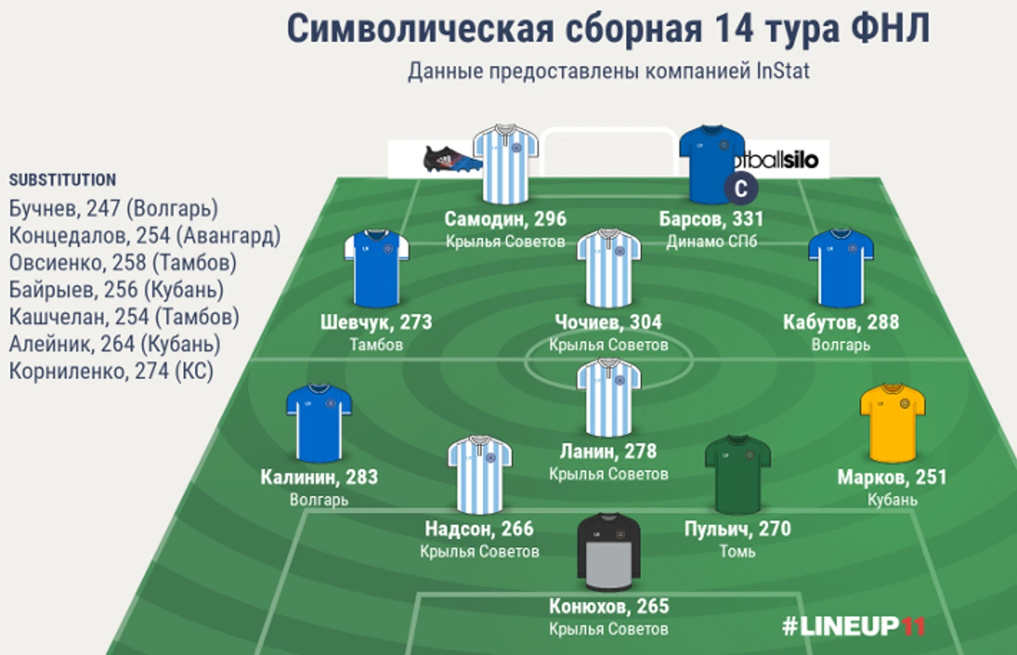 Лучшим клубом 14 тура ФНЛ опять стали "Крылья Советов" со средним общекомандным рейтингом InStat Index, равным 250 баллам. Худшей же командой оказался "Зенит-2", набравший лишь 180 баллов.