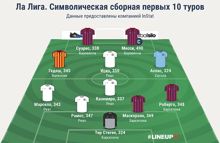 Лучшим клубом первых 10 туров стала "Барселона" со средним общекомандным рейтингом InStat Index, равным 338 баллам. Худшая команда - "Малага" с 256 баллами.