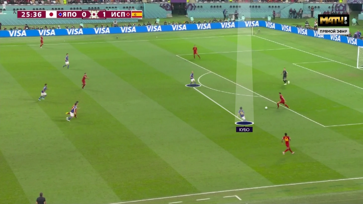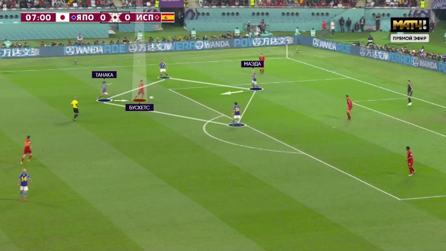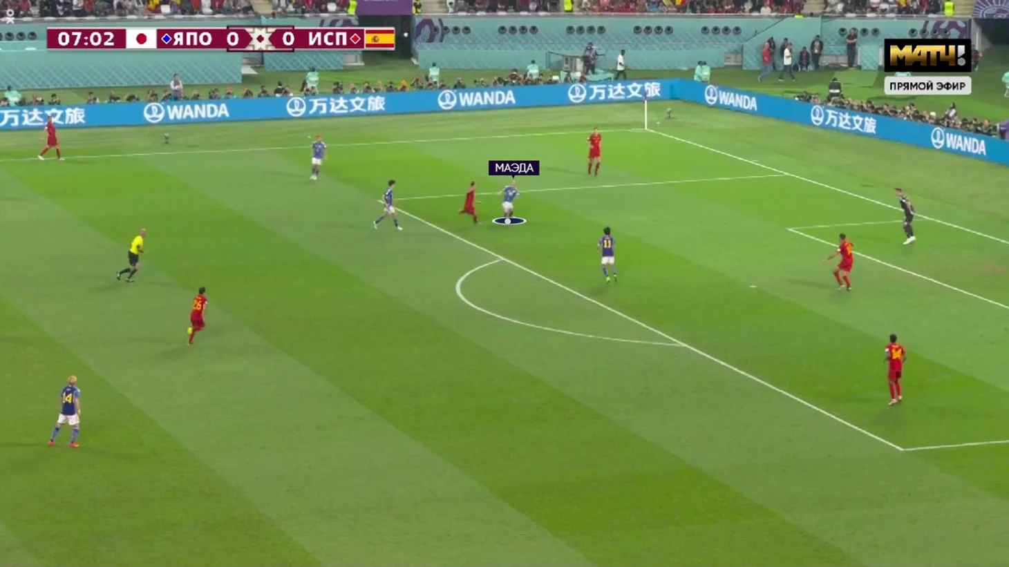 Отдельно стоит отметить Кубо – помимо вышеперечисленной роли, у него ещё была особая роль в прессинге: когда Испания разыгрывала мяч от ворот, Кубо поднимался в пару к Маэде: