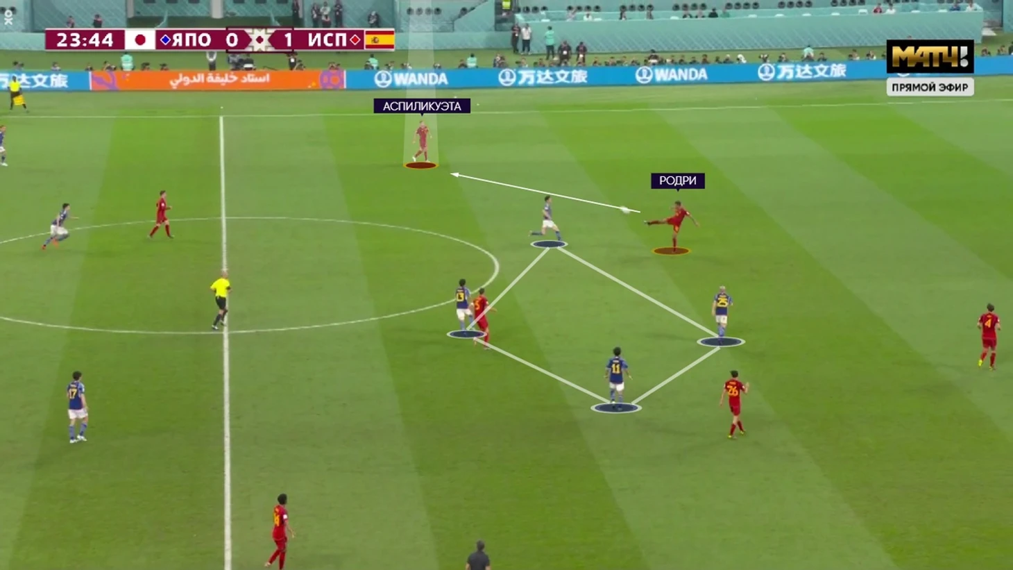 Но чаще всего Испания находила выход из-под давления японцев, одним из вариантов был Сезар Аспиликуэта, который получал много свободы в такие моменты:
