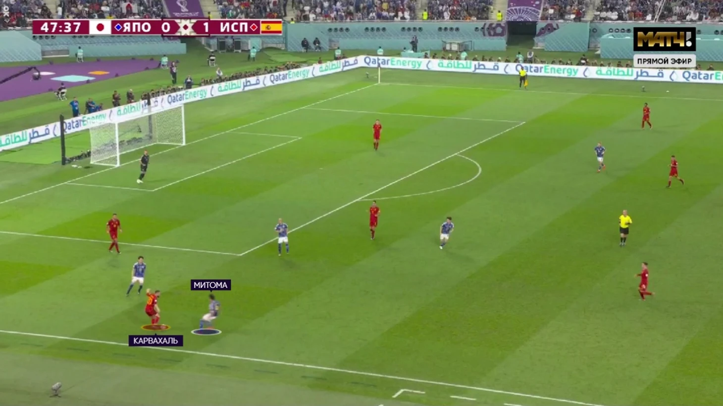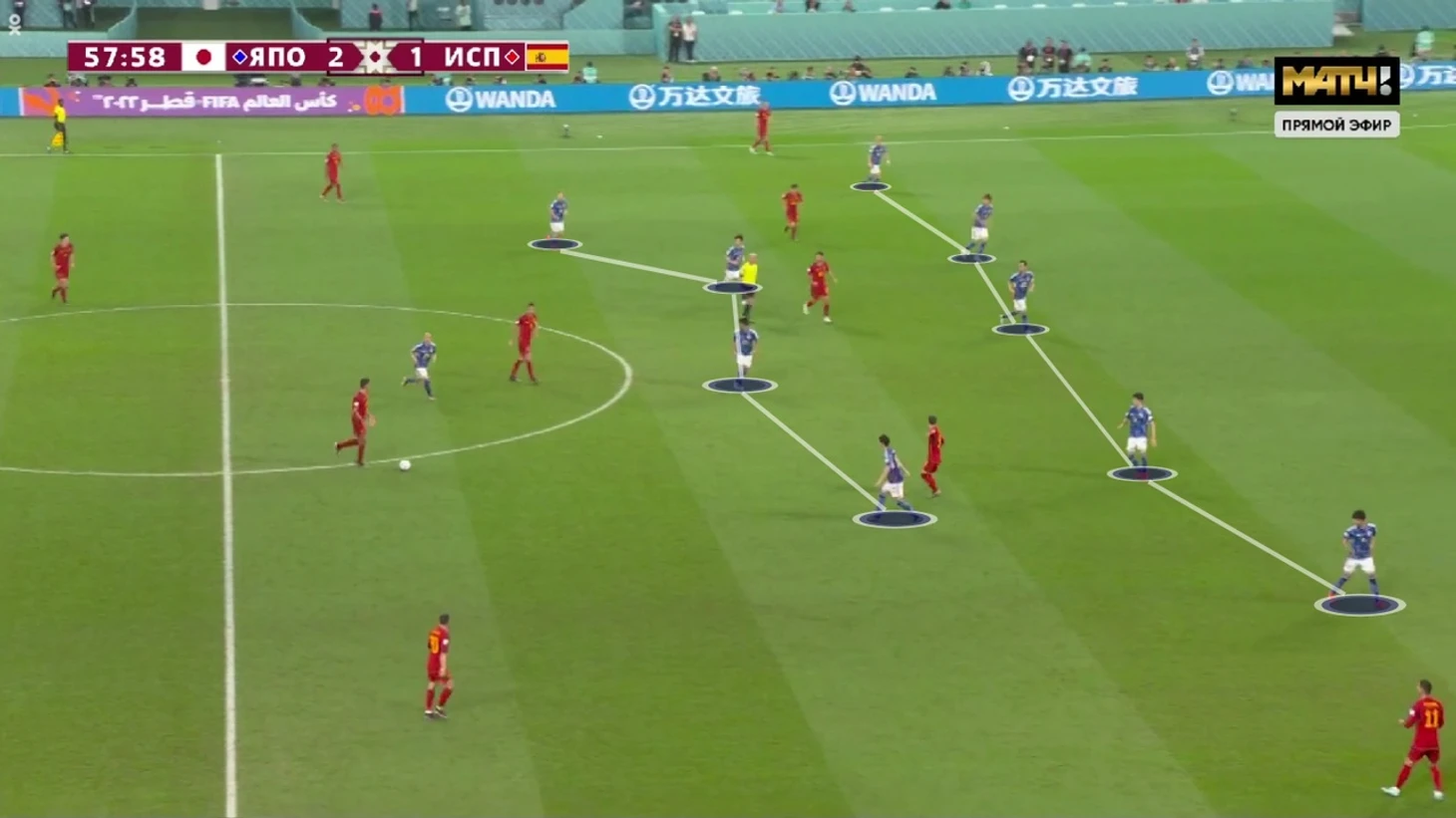 На момент перерыва турнирная ситуация Японии выглядела плачевно: Германия ведёт 1:0 в параллельной встрече и тотально доминирует над Коста-Рикой, а Япония проигрывает в счёте, да к тому же ещё и совсем не угрожает воротам. Выглядит как момент, чтобы рискнуть, чем и решил заняться Хадзимэ Мориясу: Рицу Доан заменил по позиции Такефусу Кубо, а Митома сменил Нагатомо. Вторая замена выглядит интереснее: более молодой и свежий Митома должен был прессинговать правого фуллбека Испании и «прикрыть лавочку» со свободным игроком в этой зоне. Всё это неплохо резонировало с общим желанием Японии активнее идти в прессинг. Символично, что именно с прессинга Митомы начался первый забитый японцами мяч: Каору сначала запрессинговал только что вышедшего Дани Карвахаля: