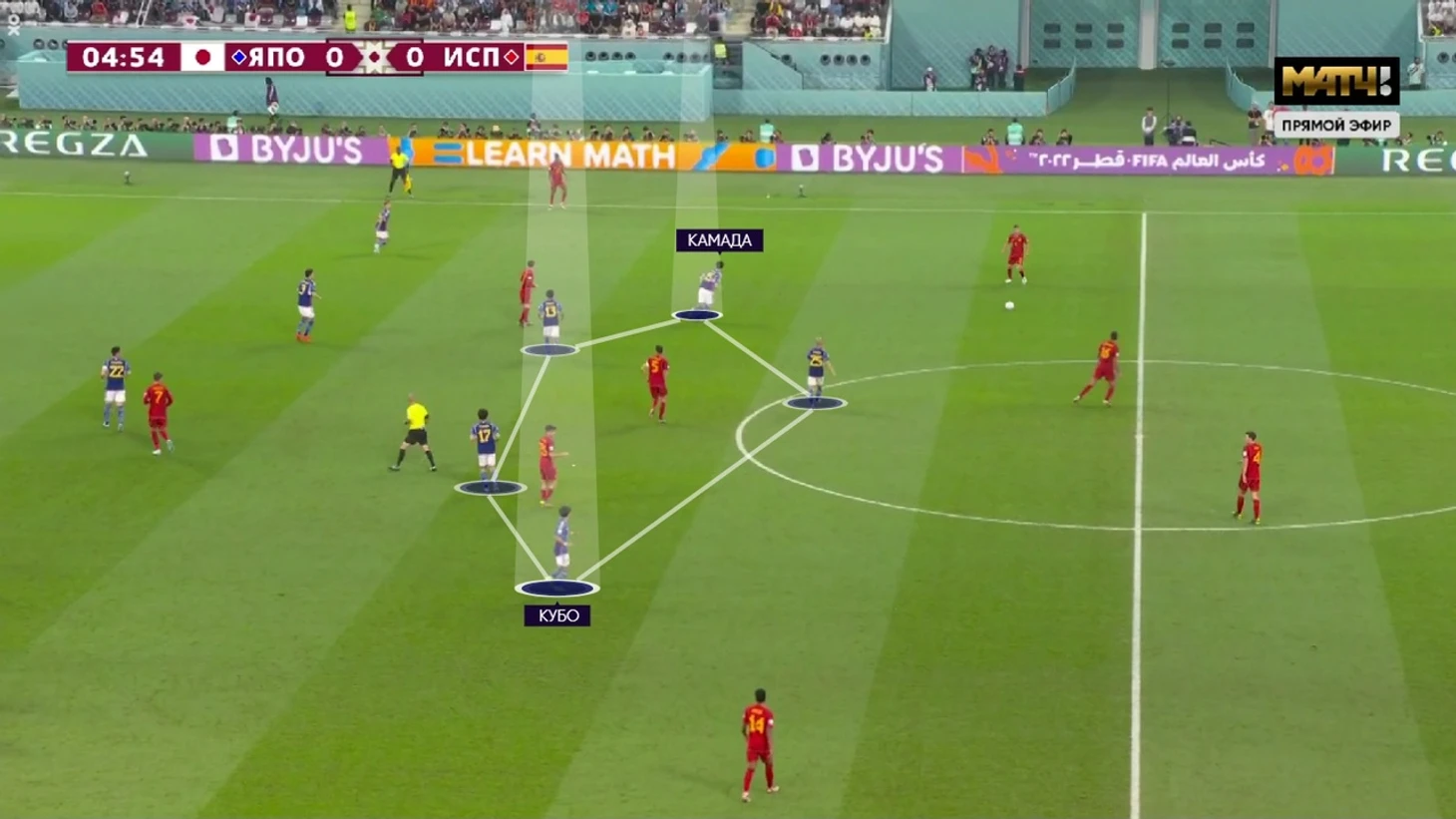 Важная роль была у фланговых игроков – Такефусы Кубо и Даити Камады. Именно за счёт их движения схема преобразовывалась из 5-4-1 в 5-2-3: