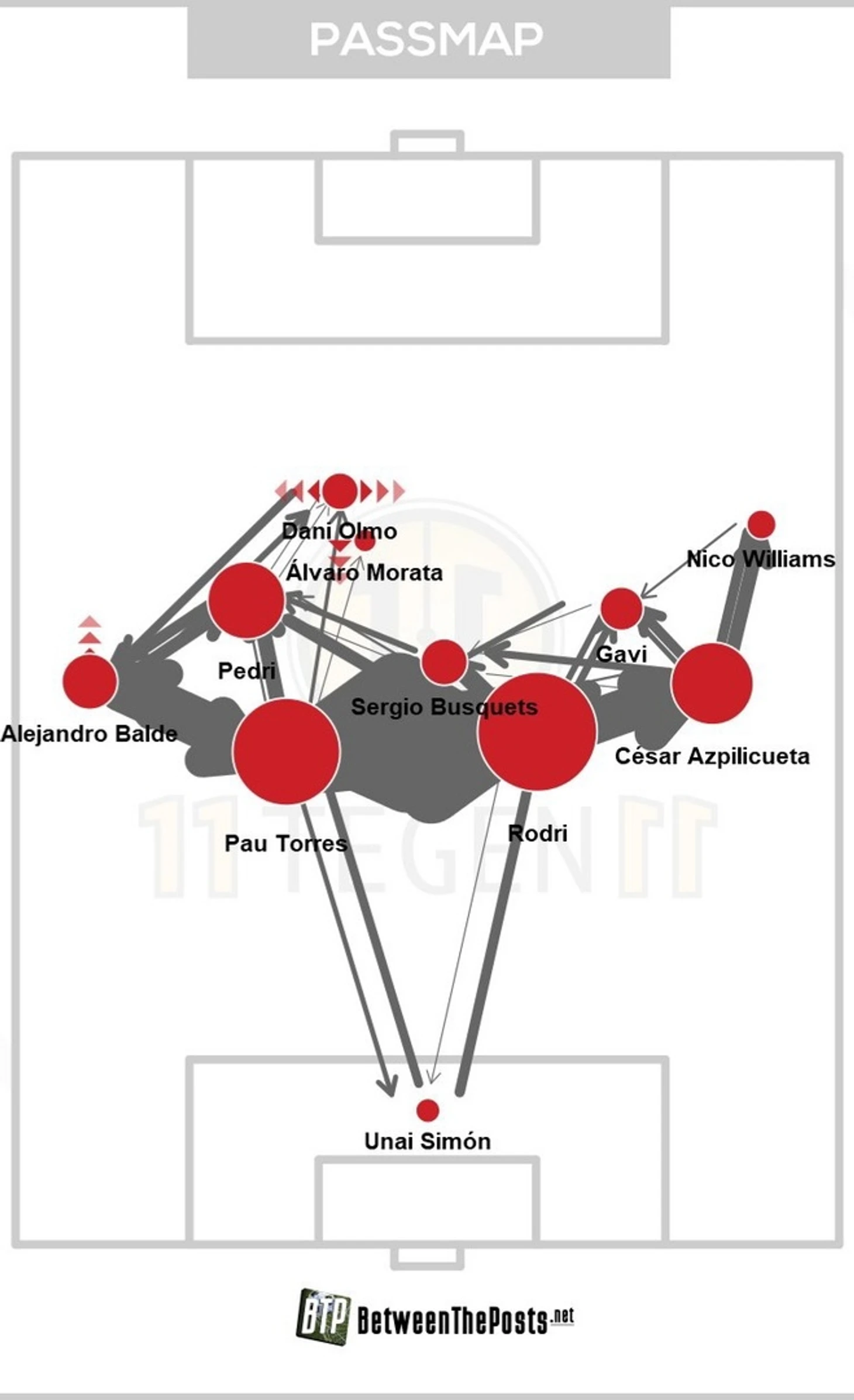 Отрезок после гола – самый загадочный. Испания владела мячом 87% времени, однако смогла нанести только 2 удара из штрафной, из которых только момент Ольмо можно считать чем-то внятным – и это проигрывая в счёте. Карта передач команды выглядит абсолютно чудовищно и очень хорошо отражает проблемность Испании в этом матче: