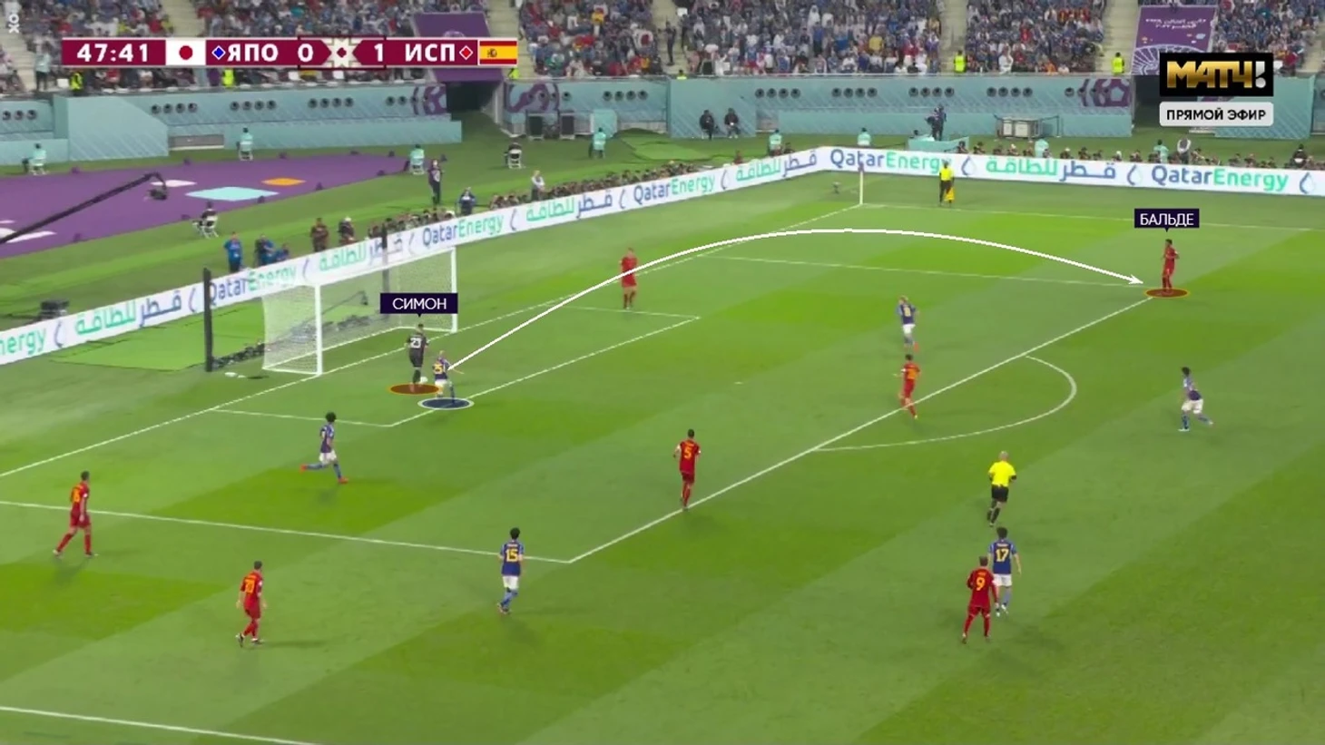 А затем мяч получил Унаи Симон, который оказавшись под свирепым прессингом японцев был вынужден давать резкий пас на Бальде, который не смог должным образом обработать мяч: