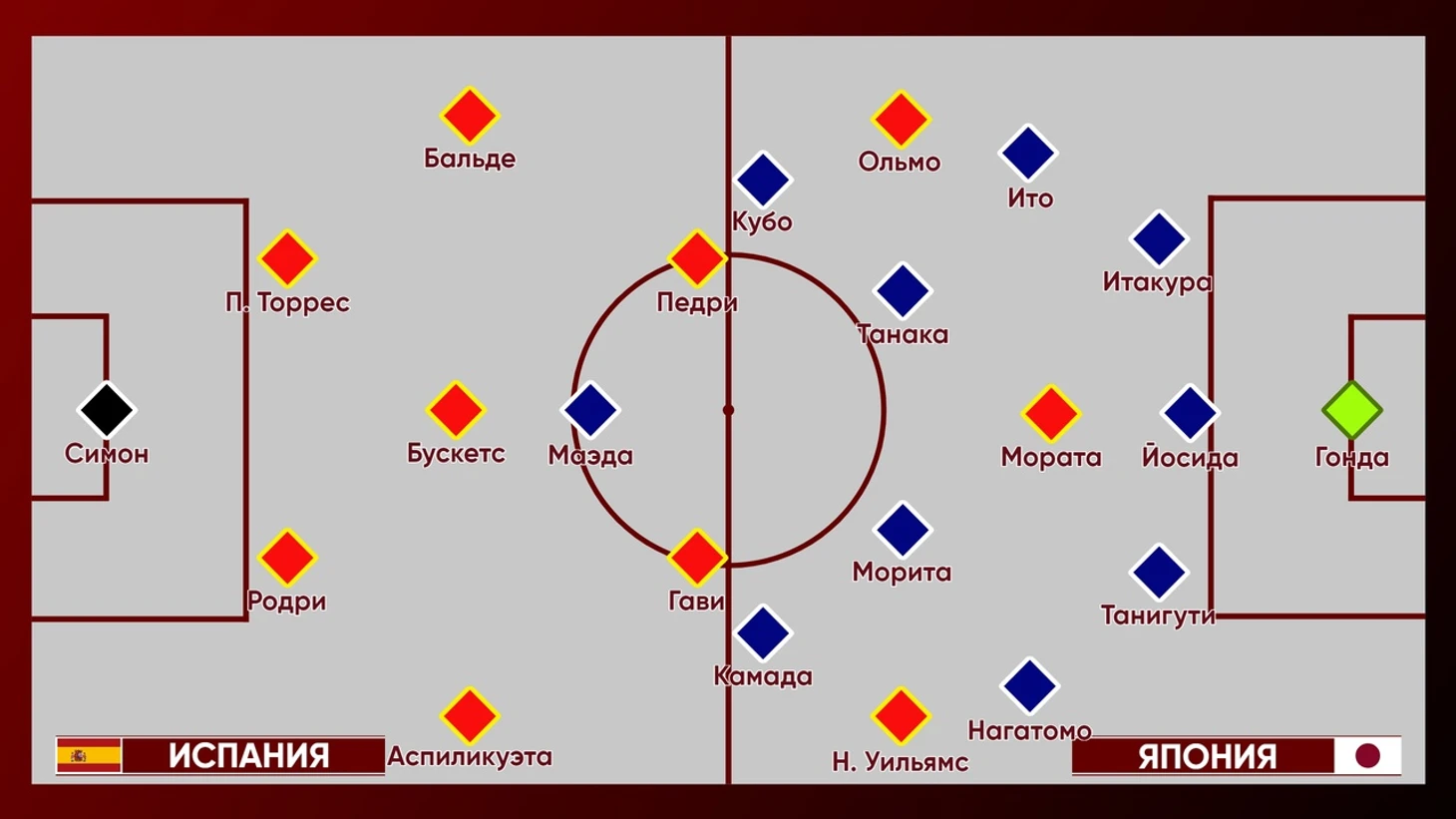 С точки зрения сдерживания топ-соперника Япония продемонстрировала довольно неплохой уровень в первом тайме, однако, если учесть, что испанцы быстро открыли счёт, то сценарий, где Испания катает мяч без обострений, но при этом и у своих ворот особо ничего не позволяет её вполне устраивал.