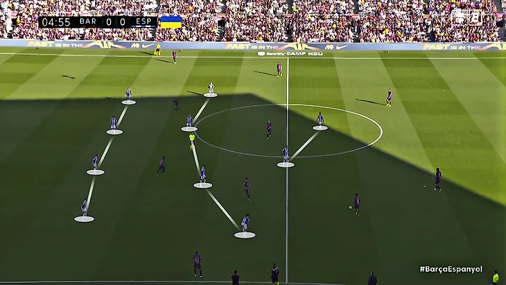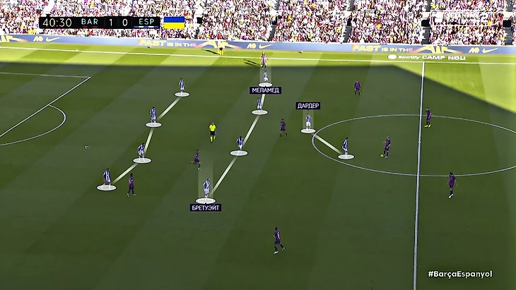 «Эспаньол» на «Камп Ноу» оборонялся по схеме 4-4-2: Серхи Дардер поднимался в одну линию к Хоселу, а Мартин Бретуэйт и Нико Меламед прикрывали фланги: