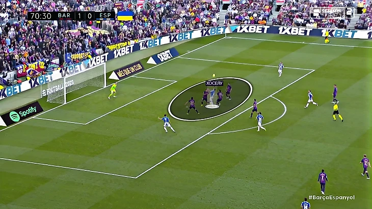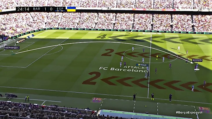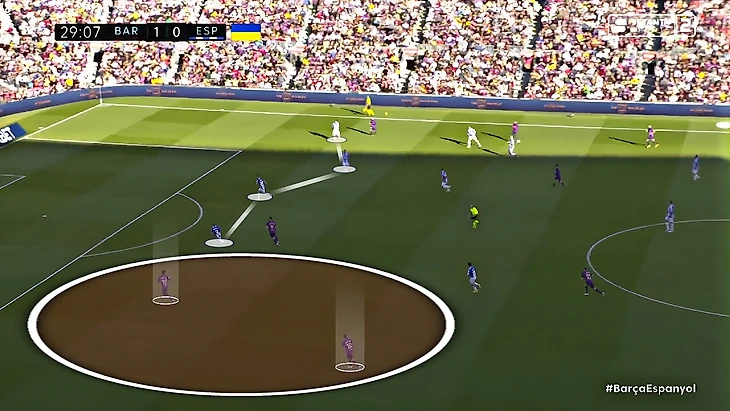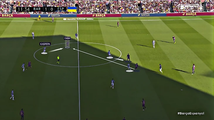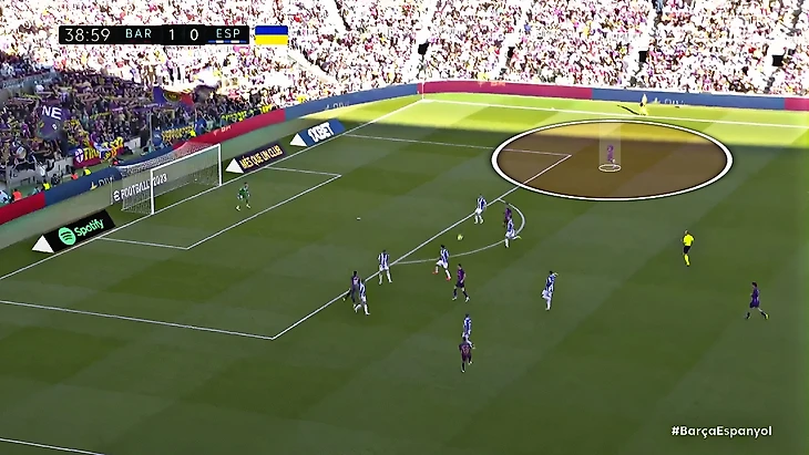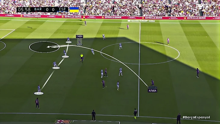 Один из индикаторов того, как «Эспаньол» оставлял пространство за спиной защитников и не «парковался» – первый опасный момент «Барселоны», где был заработан угловой, после которого был открыт счёт: Альба сделал заброс на забегающего Гави: