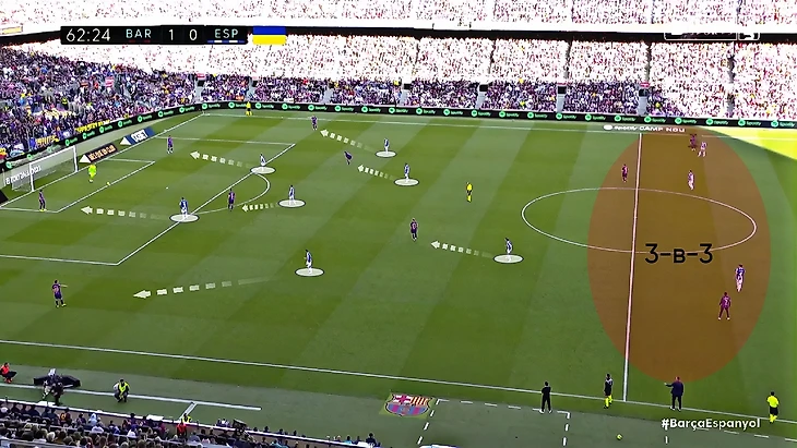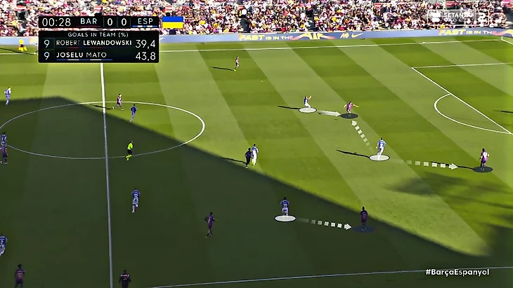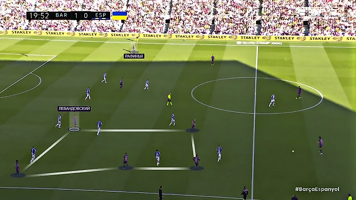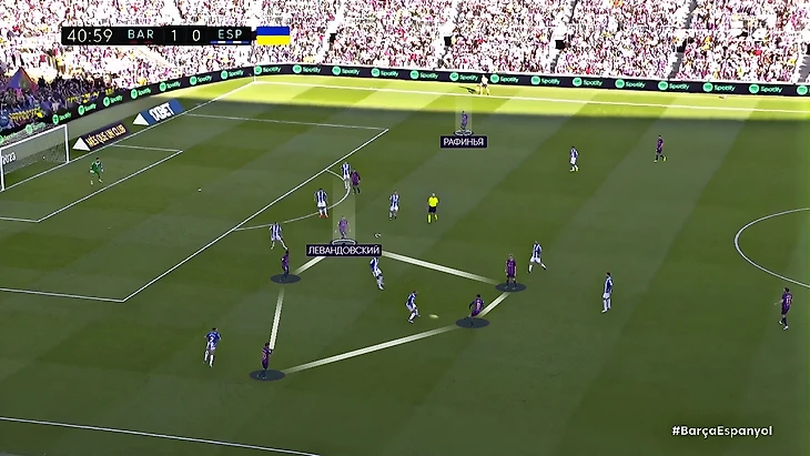 К тому же плотный средний блок «Эспаньола» оставлял пространство не только за спинами защитников, но и на флангах, поэтому Рафинья, Ансу Фати и Жорди Альба получили много свободы: