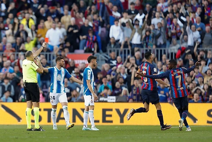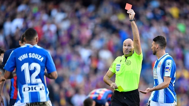 Казалось бы – каталонское дерби, которое было ещё вдобавок сопряжено некоторыми скандалами перед его началом. Почва для большого накала страстей действительно была, однако до 72-й минуты, матч на удивление проходил в довольно спокойной манере. Лаос обеим сторонам прощал грубость и в рамках приличия давал бороться, но, видимо, Матеу такой расклад не очень устраивал – судья не в эпицентре событий и его никто не обсуждает. Поэтому почти сразу после гола мы увидели настоящее шоу в исполнении испанского арбитра – две карточки Альбе за разговоры, в которых ничего особенного не было. Что же, теперь, после 72-й минуты, к арбитру резко стало нельзя обращаться? Не только обращаться, но и грозно смотреть тоже! На 75-й минуте именно за взгляд Ферран Торрес получил свой «горчичник». Особенно мне понравилась переквалификация прямой красной для Леандро Кабреры в отсутствие карточки вообще! Что ж, возможно там и не было повода давать прямую красную, однако как этот эпизод не обернулся для уругвайца второй жёлтой, если честно, не очень понятно.
