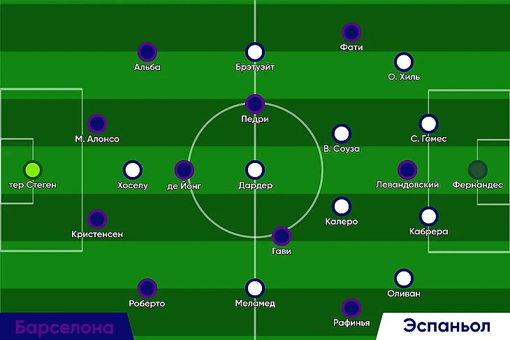 У «Барселоны» впервые в сезоне лазарет пуст и все игроки были доступны для матча с «Эспаньолом». Даже Роберту Левандовскому приостановили 3-матчевую дисквалификацию из-за рассмотрения апелляции. Конечно, были свои нюансы: Кунде и Дембеле дошли до финала ЧМ и поэтому позже остальных вернулись в расположение клуба и не были готовы на 100%. Мы увидели ожидаемый стартовый состав, с оговоркой на полную готовность футболистов: фланги обороны Альба – Роберто, де Йонг вместо Бускетса на позиции реджисты и Ансу Фати с Рафиньей на флангах атаки.