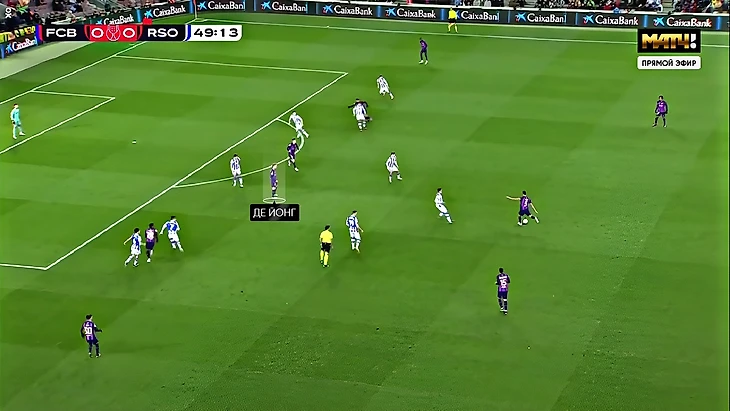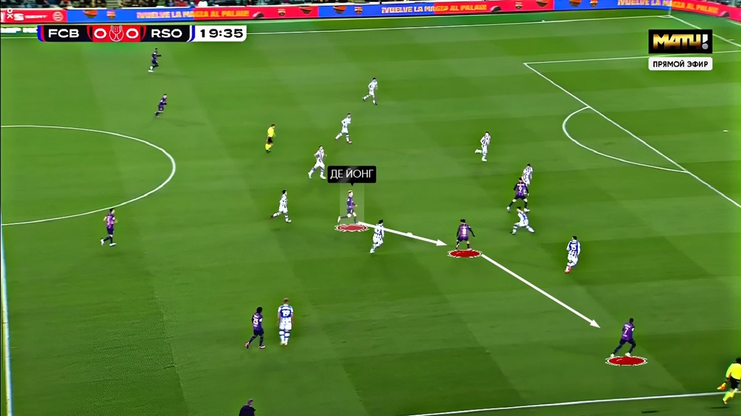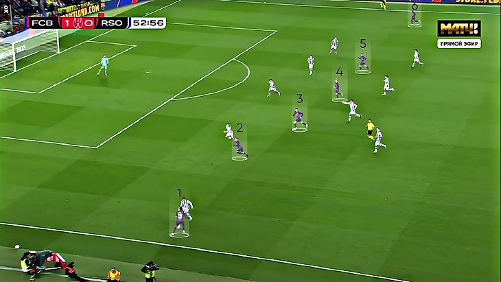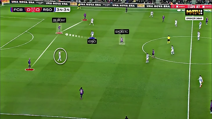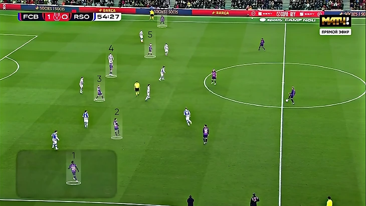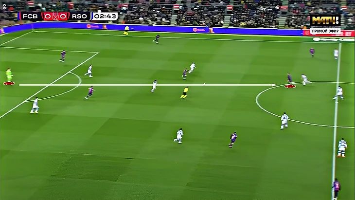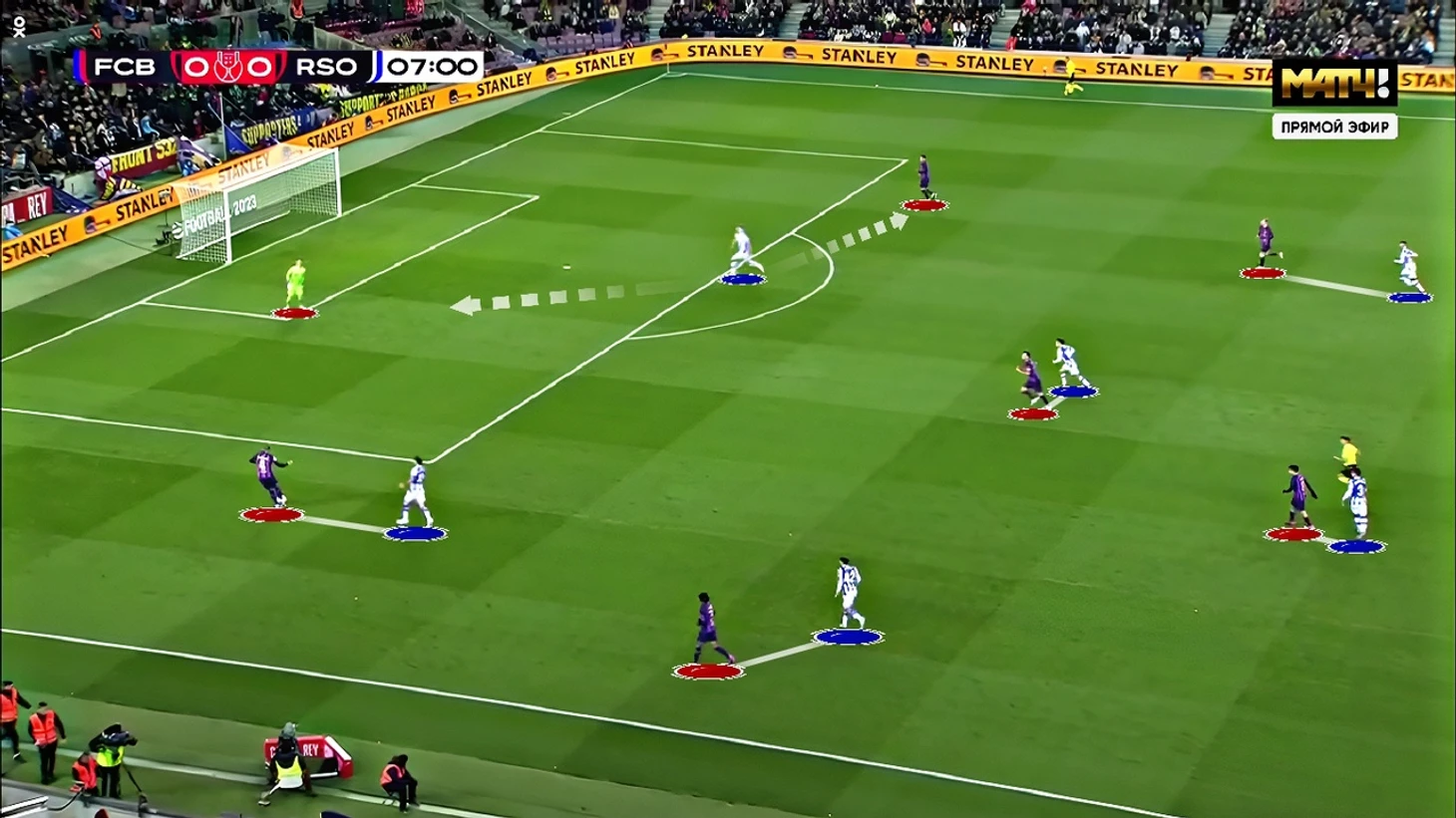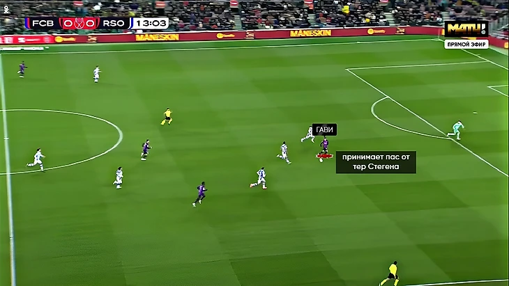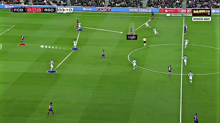В этом эпизоде «Барселона» проходит прессинг «Сосьедада» уже благодаря опусканию Гави: