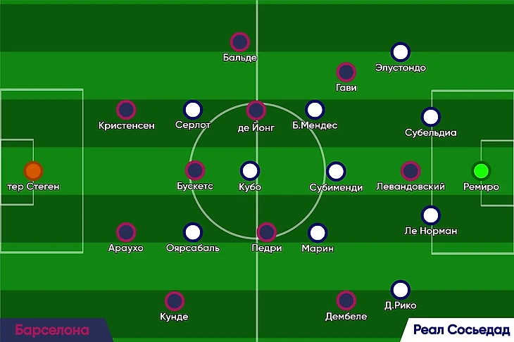 В четвертьфинале Кубка Испании «Барселона» на «Камп Ноу» принимала одну из лучших испанских команд в этом сезоне – «Реал Сосьедад». Возможно, для тех, кто не особо следит за Ла Лигой эта мысль не такая очевидная, но прямо сейчас «бело-голубые» идут на третьем месте в чемпионате с отрывом 7 очков от ближайшего преследователя («Атлетико Мадрид»). Модель ожидаемых очков (xPts) вообще ставит «Сосьедад» на второе место в Испании вслед за «Барселоной». Если учитывать качество игры, а также стиль в котором играет команда при Иманоле Альгуасиле, то смело можно было ожидать очень интересную дуэль команд, которые исповедуют похожие принципы игры. В этом смысле получилось интересно, но однобоко: даже до удаления Браиса Мендеса «Барселона» абсолютно доминировала и должна была забивать как минимум один, ну а красная карточка, очевидно, совсем изменила характер матча. Давайте взглянем на эту игру поподробнее!
