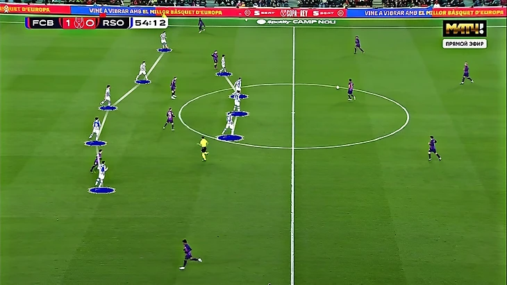 Матч с «Барселоной» для «Сосьедада» не стал поводом, для того, чтобы как-то отказаться или адаптировать своё давление – всё так-же шли смело и интенсивно: