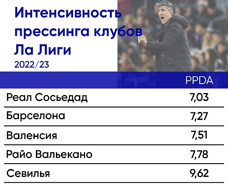 Как уже было сказано ранее, «Реал Сосьедад» при Альгуасиле играет в позиционный футбол и ему близки те же ценности, что и «Барселоне». Поэтому обе команды высоко и интенсивно прессингуют, а по метрике PPDA «сине-голубые» вообще выше «каталонцев»: