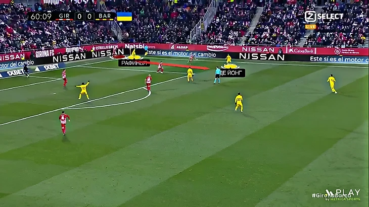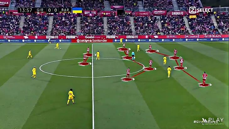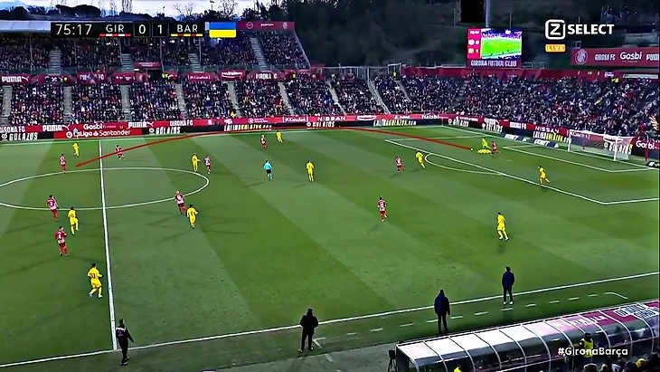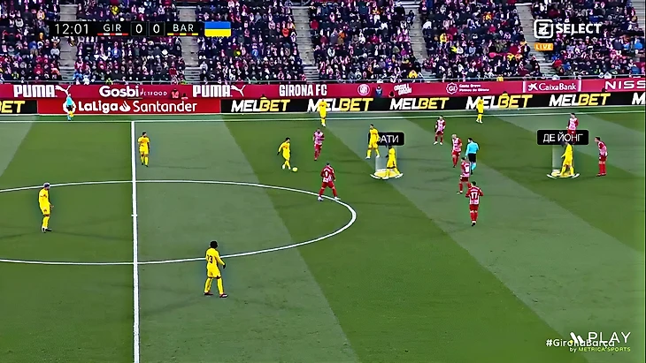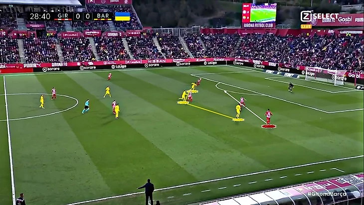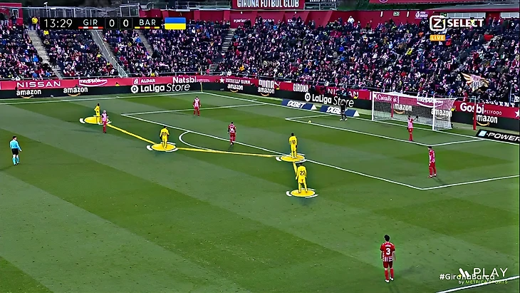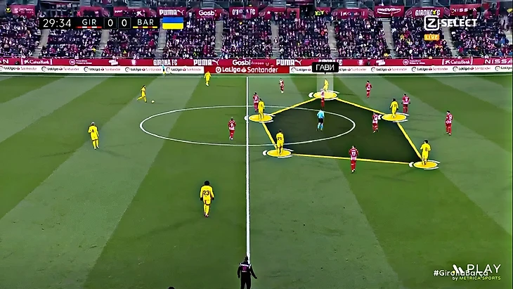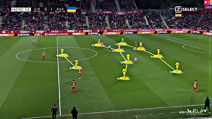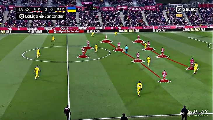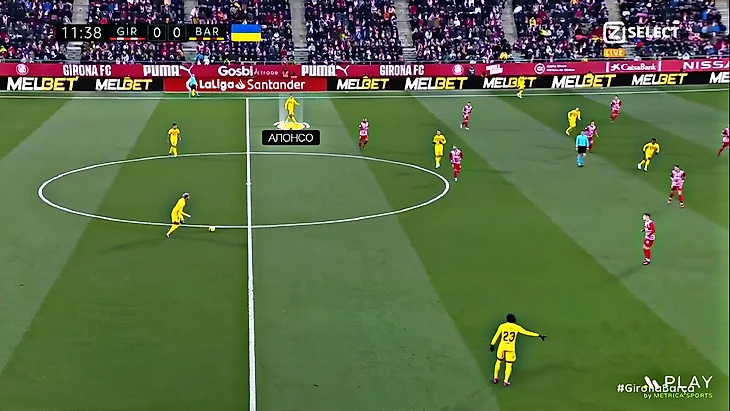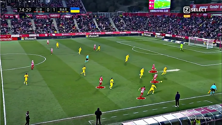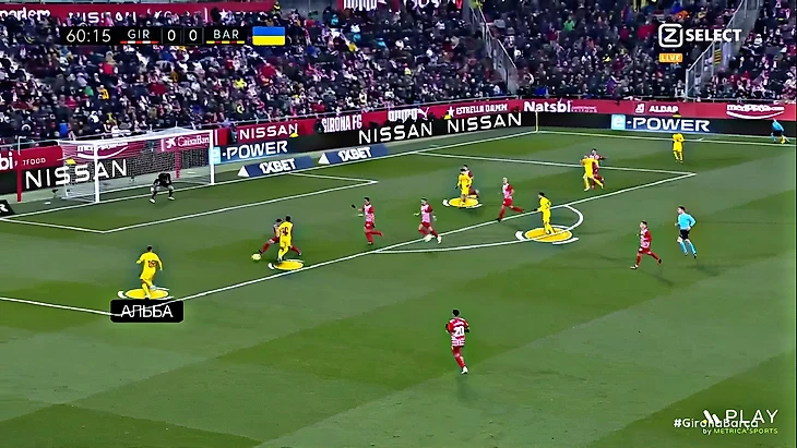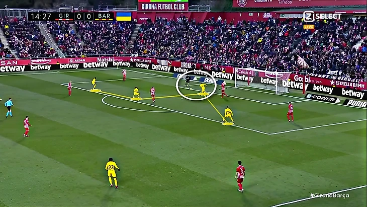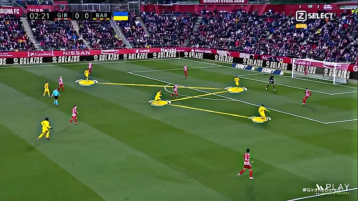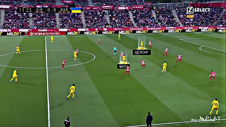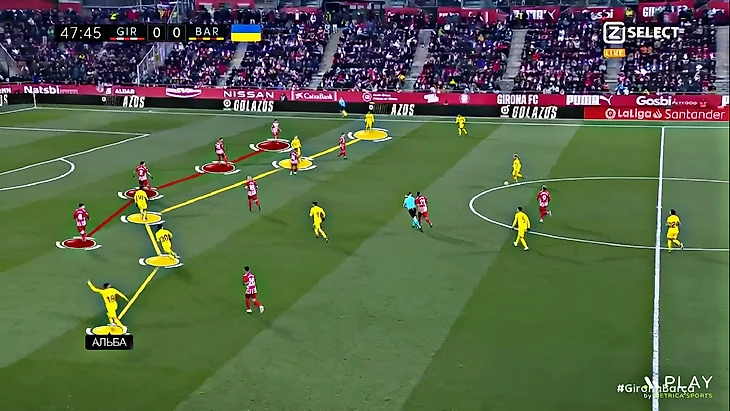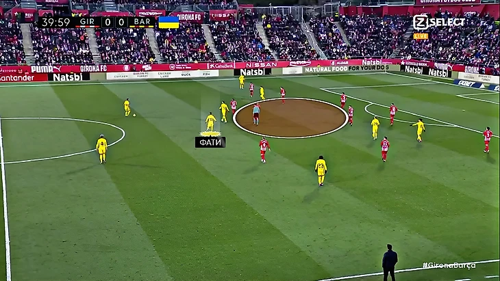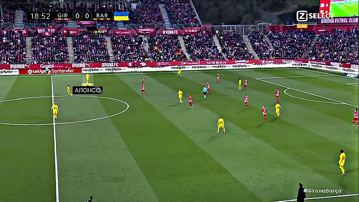 Без Левандовского Хави использует Фати на позиции «ложной девятки» и получается с переменным успехом. В последнем матче против «Хетафе» (1:0) Ансу в этой роли выглядел не очень здорово – бросалась в глаза плохая взаимосвязь с партнёрами, что выражалось в неправильном тайминге открываний и опусканий. Но альтернатив в такой ситуации нет, поэтому и в матче с «Жироной» Фати снова сыграл в роли «ложной девятки». В моменты, когда Ансу опускался за мячом, освободившуюся зону часто заполнял Френки де Йонг: