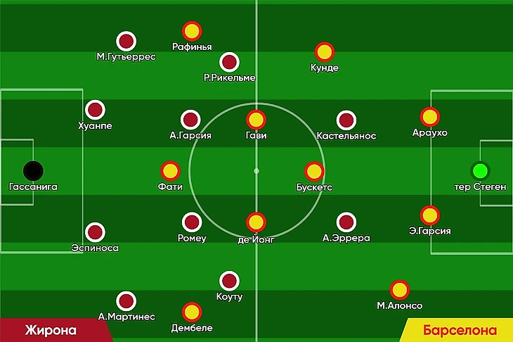 С точки зрения травмированных «Барселона» подходила к этому матчу без потерь. Но из-за дисквалификаций игру пропускали Роберт Левандовский и Ферран Торрес – в следующих турах оба уже будут доступны. В двух предыдущих матчах без Левандовского на его позиции (только в роли «ложной девятки») выходил Ансу Фати, и матч против «Жироны» не изменил тенденцию. В этот раз мы не увидели с первых минут варианта игры с четырьмя полузащитниками, который стал основным в последнее время. Возможно это связано с намерением дать Педри отдохнуть – в прошлом матче он покидал поле прихрамывая. Так или иначе, ему всё равно пришлось вступить в игру уже на 25-й минуте. Эрик Гарсия появился в стартовом составе вместо Адреса Кристенсена – просто ротация. Зачем Хави поставил Алонсо в роли левого фуллбека с первых минут? Здесь уже, извините, у меня догадки заканчиваются, самого терзает такой же вопрос.