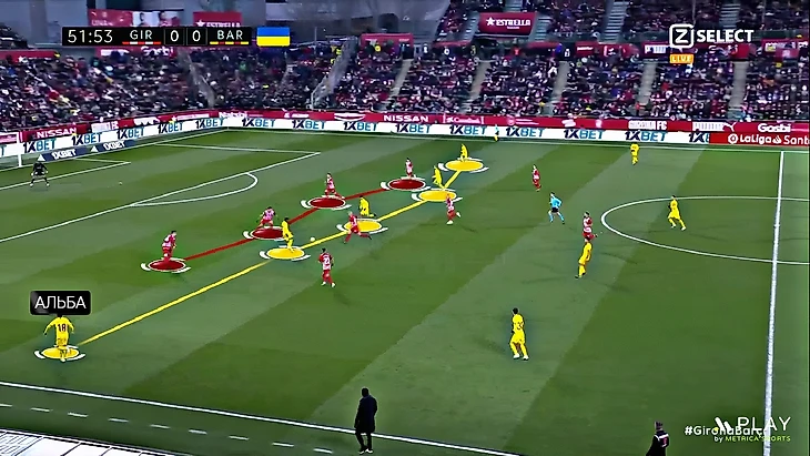 Обычно команды в Ла Лиге сталкиваясь с давлением «Барселоны» стараются просто его перебросить и сыграть через высокого нападающего. «Жирона» в общем-то тоже прибегала к такой опции, но это чередовалось с попытками коротко разыгрывать от вратаря. Замысел не очень удался – получилось так, что «бело-красные» сами подставлялись под высокое давление «Барселоны» и часто не справлялись с ним: