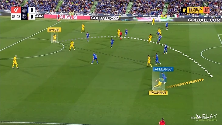А вот уже и прямая угроза Рафиньи воротам «Хетафе» – бразилец блестяще отклеивается от Альвареса, а Кунде (о котором мы ещё поговорим) классно забросил. Самый опасный момент: