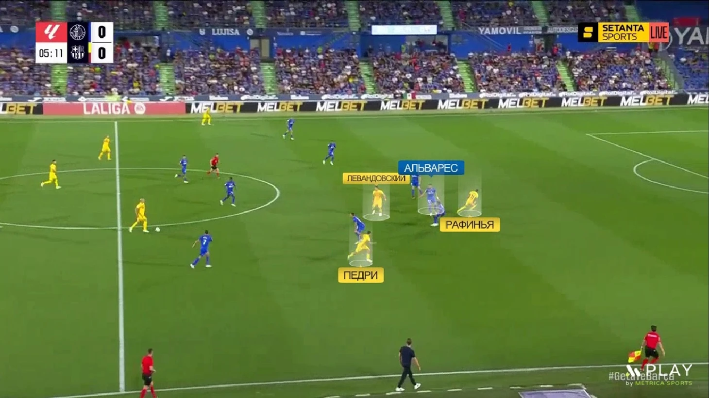 Но гораздо более интересная динамика наблюдалась на правом фланге «Барселоны» – там Рафинья начал терроризировать Альвареса рывками за спину. Сначала не самый очевидный эпизод – Левандовский оттянулся на правый фланг, а Рафинья сознательно ушёл открываться в центр атаки (и уже даже в офсайде находится), на что реагирует Альварес и сужается. Педри не самым лучшим образом воспользовался большим пространством на фланге: