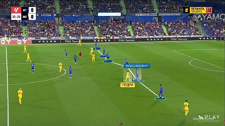 Но в этом ничего необычного нет. У «Барселоны» есть инструменты, которые даже из численного равенства в передней линии позволяют извлекать преимущество. А вот что можно увидеть не так часто – так это оборону с шестёркой сзади. Обычно к защитникам садился Максимович – он реагировал на расположение правой восьмёрки «Барселоны»: