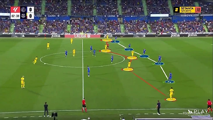 После удаления Маты мы ещё какое-то время продолжили наблюдать за атакующими свершениями Рональда Араухо в атаке, но становилось очевидно, что в равных составах уже нужно выпустить туда более профильного игрока. Таковым стал 16-летний Ламин Ямал – совсем не сюрприз. На предсезонке он выходил именно на эту позицию и здорово себя проявил. Также Хави почти полностью освежил переднюю пятёрку – выпустил Фати и Гави. По сути схема «Барсы» стала выглядеть как просто 4-0-5 с очень смелым наполнением: