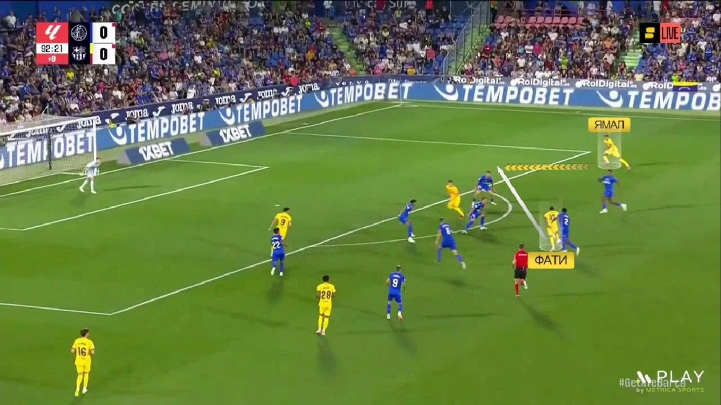 Ансу Фати уже давно проявляет признаки жизни – как будто снова появилась резкость, но по-прежнему есть проблемы с реализацией. Вот пример его отличной игры в узком пространстве: классно разобрался с Дуарте перед штрафной, стянул на себя игроков и почти обострил на Ямала – проблема была не в пасе, просто Ламин плохо рассчитал траекторию мяча: