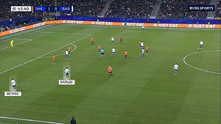 Как вариант: чтобы уйти от персоналок «Шахтёра». Для Феликса может быть актуально, но Бальде не в широкой позиции становится просто бесполезным элементом. Алекс не самый изящный игрок, но на фланге он может проявить себя за счёт высокой скорости и левой рабочей ноги. Ближе в центру это никак не было нужно – ни Феликс, ни Бальде не использовали свои сильные качества.