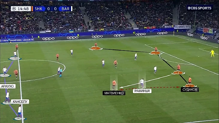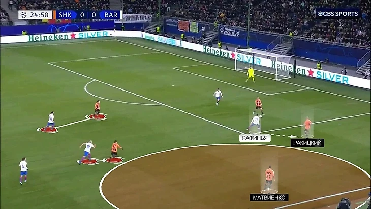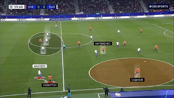 Во-первых, поменялось расположение игроков при давлении. В последних матчах в линию к нападающему поднимался полузащитник, а вингер действовал по крайнему защитнику соперника. Теперь же на линии с Левандовским был Рафинья, а Канселу оставался в низкой позиции, так как его оппонентом был Невертон. Вот наглядный пример провала такого давления: мяч на фланге и у «Шахтёра» есть свободный игрок. В предыдущих матчах «Барса» на фланге создавала 1-в-1.