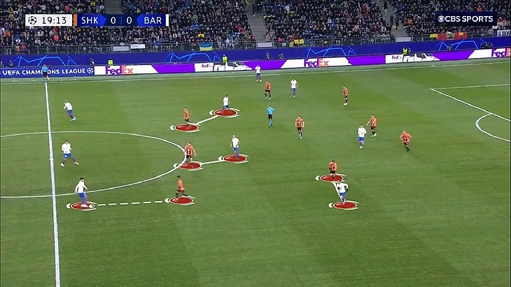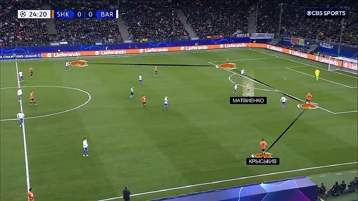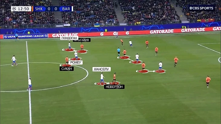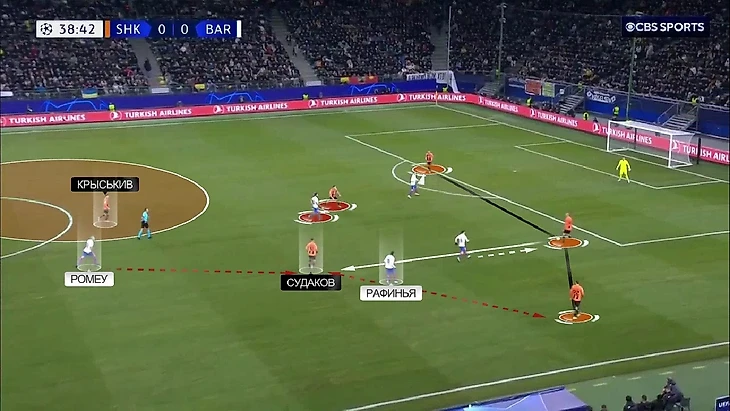 С приходом Канселу «Барса» явно стала более заточенной на созидание через центр. Отсюда и столько проблем с середняками Ла Лиги – они быстро нащупали эту склонность и стали перекрывать центральное направление. «Шахтёр» тоже сделал акцент на центре поля, но другим, более изящным способом – с помощью персональных ориентировок. Сикан и Крыськив могли передавать друг другу Ромеу, а вот у остальных почти всегда был прямой оппонент:
