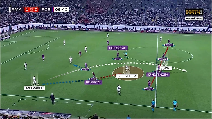 Но в эпизоде со вторым голом это проявилось ещё ярче. Снова свободный Беллингем, а Роберто оказался в полупозиции. На Джуда снова выдвигается Кристенсен, у которого за спиной Родриго. Карвахаль, из-за того, что на него вообще не оказывается давление, без труда делает заброс на Родриго – вот тебе и 2:0: