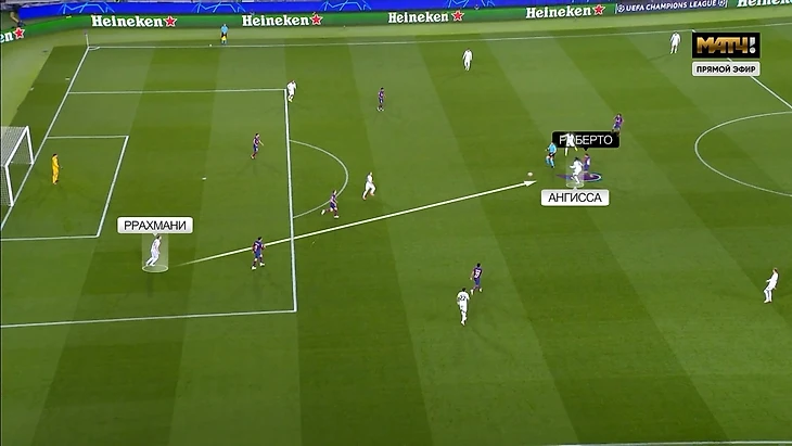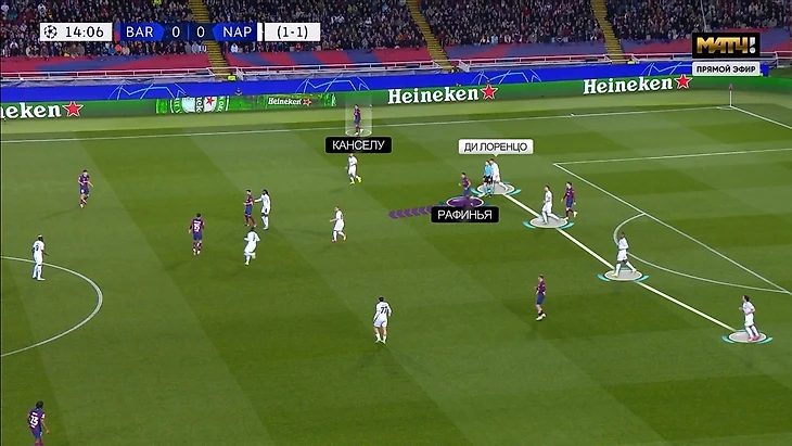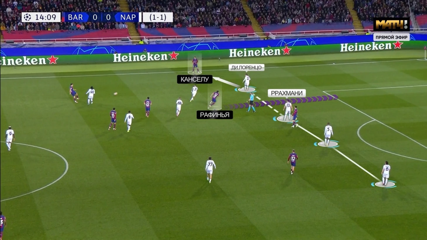 Как только Ди Лоренцо переключается на Канселу, Рафинья тут же бежит открывается в образовавшийся между Ди Лоренцо и Ррахмани разрыв: