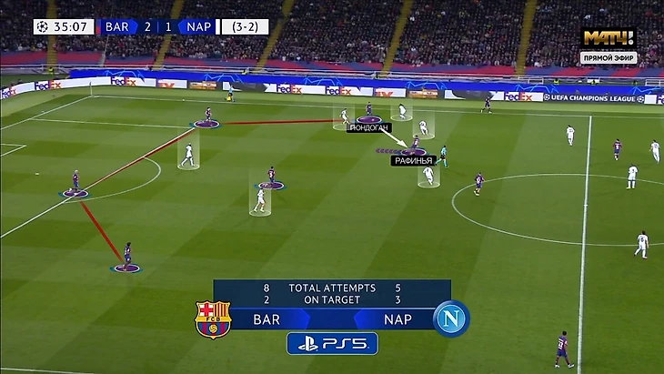 По классике, триггером для «Барсы» были передачи «Наполи» на фланг – в такие моменты каталонцы включали интенсивность и не оставляли вариантов неаполитанцам: