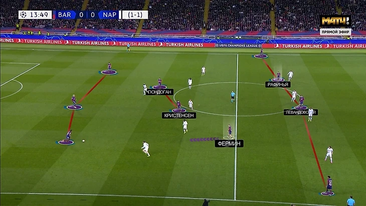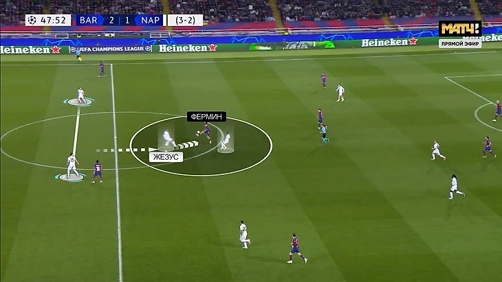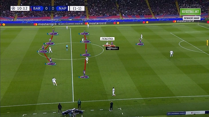 Как мы уже говорили ранее, Фермин играл по Лоботке – реджисте «Наполи» которого закрыть особенно важно и трудно. Это прослеживалось как в прессинге, так и в позиционной обороне «Барселоны»: